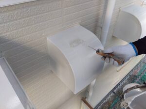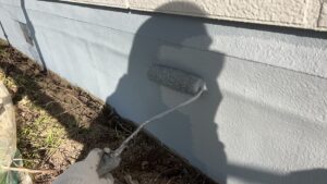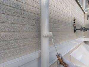 今回は、雨樋や幕板などの付帯部、そして基礎部分の上塗り工程の様子をお届けします。